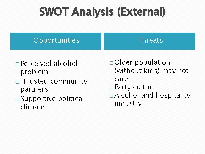 SWOT Analysis (External) Opportunities � Perceived alcohol problem � Trusted community partners � Supportive political climate Threats � Older population (without kids) may not care � Party culture � Alcohol and hospitality industry