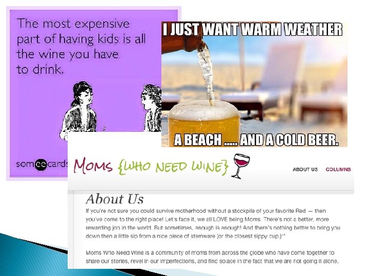 Competing behaviors and messages Behaviors: � No time for self-reflection � Denial � No incentive to do it � Self-efficacy: lack of tools, confidence Messages: � There’s no problem � My behavior doesn’t influence my kids’ behavior � I need my wine � Drinking is a right of passage