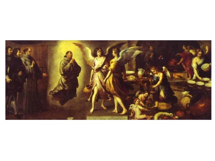 Bartolomé Estéban Murillo (1617 -1682 • Významný malíř španělského baroka, jeho kariéra spadá do 2. poloviny 17. století • Působil v Madridu a Seville, přední malíř tzv sevillské školy • Vlivy: Velázquez, benátské a vlámské malířství • Dílo • Žánrové výjevy » Osoby z ulice, květinářka, přadlena, děti, žebráci • Náboženská tématika » Neposkvrněné početí, Nanebevzetí Panny Marie » Andělská kuchyně » 11 obrazů věnovaných františkánským světcům