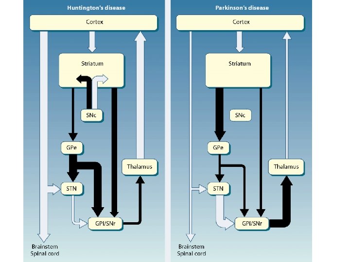 Diagram to explain changes of gene expression in basal gangila circuitry after 6 OHDA-lesion of the dopaminergic cells of the SN. This lesion result in increased ENK expression and activity of striatopallidal neurons. This results in increased firing of SNr. GABAergic neurons and diminished activity in thalamo-cortical axons.