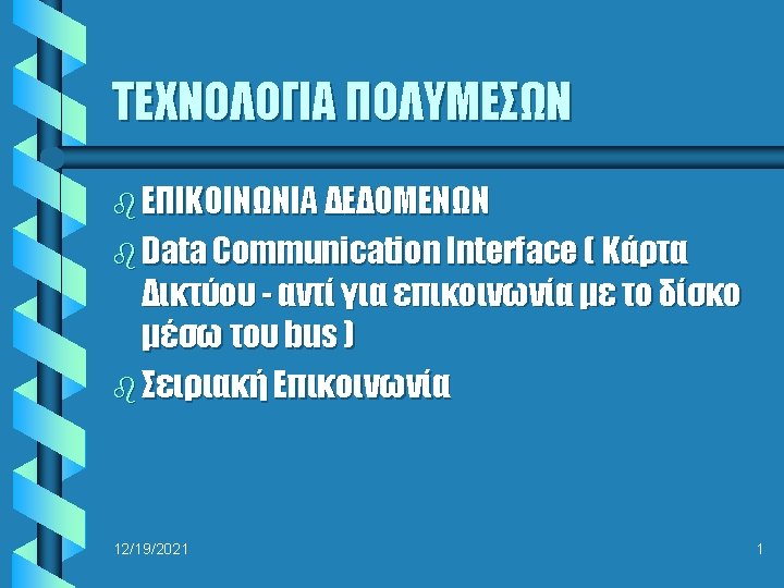 … Στοιχεία του Δικτύου b Transmission components : Σύρματα, οπτικές ίνες, επαναλήπτες (repeaters) κτλ. b Switching components : Διακόπτες, routers, PBXs, ISDN exchanges, ATM switces κτλ. b Store-and-forward application relays : Message Transfer Agents (MTAs) 12/19/2021 20