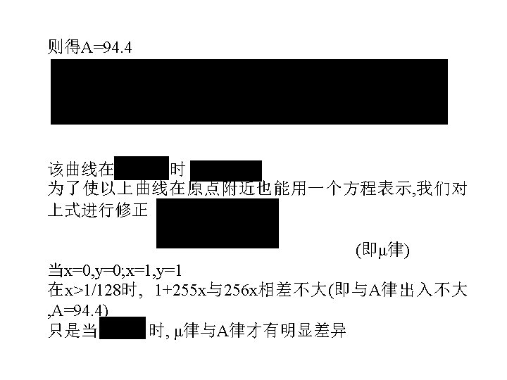 • In general, the second method is adopted. Let first that the analog signal passes through a compression (nonlinear)amplifier • Concept of non-uniform quantification • 1. The step of quantification is proportional to the input of quantizer. • 2. The RMS of quantizing noise power is proportional to the sampling value. • To satisfy these conditions, we have two widely used compression laws---- μ-law and A-law y=ln(1+μx)/ln(1+μ) (μ-law ) y=Ax/(1+ln. A) 0≤x≤ 1/A (A-law) y=(1+ln. Ax)/(1+ln. A) 1/A≤x≤ 1