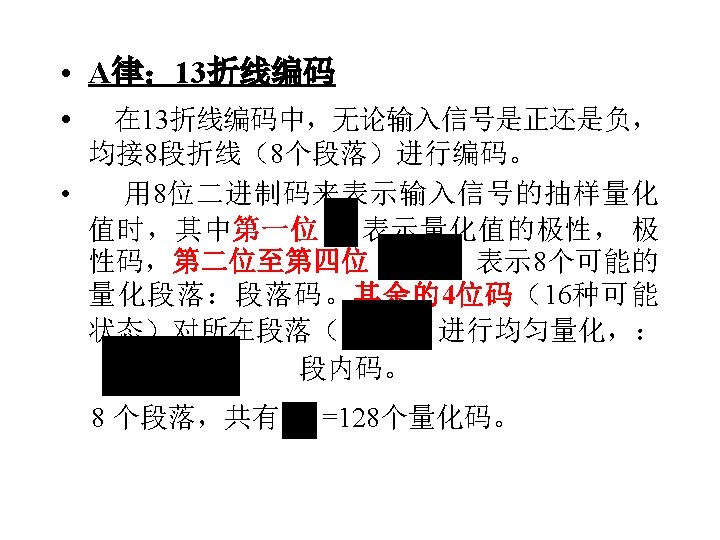 • The composition of non-uniform quantized code of the voice: • 1. Normalization and polarity (polarity bit 1 for x>0 and 0 for x<0) • 2. Segmentation for non-uniform quantification • 3. Non-uniform quantification for each segment (3 bits for 8 segments) • 4. Uniform quantification for inside of each segment (4 bits for 16 quantizing levels) Polarity bit Segment bits Linear quantizing bits for inside of each segment