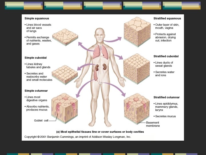 Classes of Epithelia Simple: just one layer or cell shape Stratified: multiple layers and cell shapes