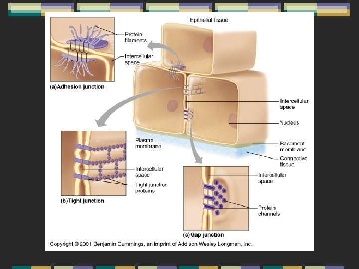 Cell Junctions Desmosome: binding spots between cells with proteins called cadherins Tight junctions: impermeable l E. g. gut tube, doesn’t let enzymes from gut into blood stream Gap junctions: tubes that let small molecules pass between cells