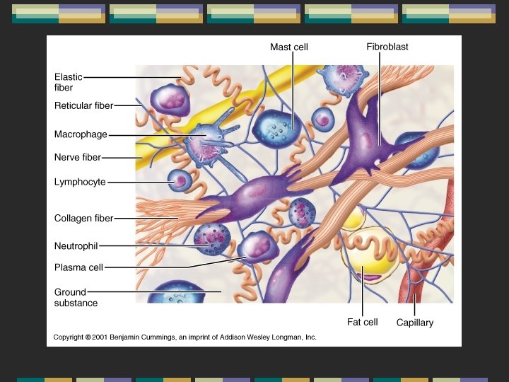 Cells of Connective Tissues Fibroblasts make fibers Immune cells in areolar tissue Macrophages l Plasma cells l Mast cells l Neutrophils, Lymphocytes l