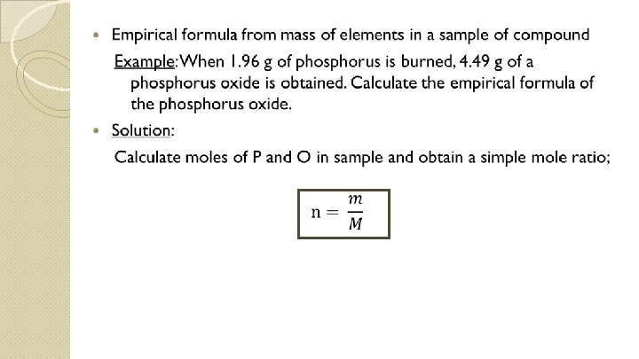 P moles Divide by mole of P (smaller value) to get a simple mole ratio Mole ratio Simple mole ratio O 1. 96 g / 30. 97 gmol-1 = 0. 0633 mol (4. 49 g – 1. 96 g) / 16. 00 gmol-1 = 0. 158 mol 0. 0633 mol / 0. 0633 = 1 mol 0. 158 mol / 0. 0633 = 2. 5 mol 1 mol 2 mol Empirical formula = P 2 O 5 2. 5 mol