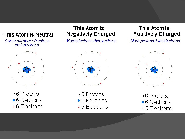Ionic Bonding: Ions = charged atoms because they have gained or lost electron(s) ○Cations - Atoms that lose electrons become more positive ○Anions- Atoms that gain electrons become more negative ○Atoms gain/lose electrons efficiently