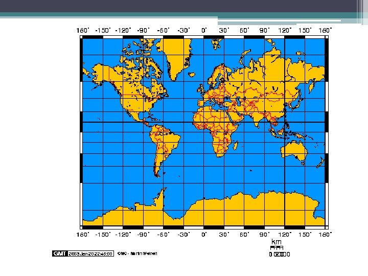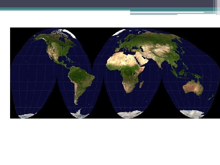 Different types of projection • Robinson – shows information across oceans, with less distortion there • Mercator – the poles are the area of greatest distortion • Goode homolosine projection – interrupted map that preserves angles and scale, most distorted around Asia.