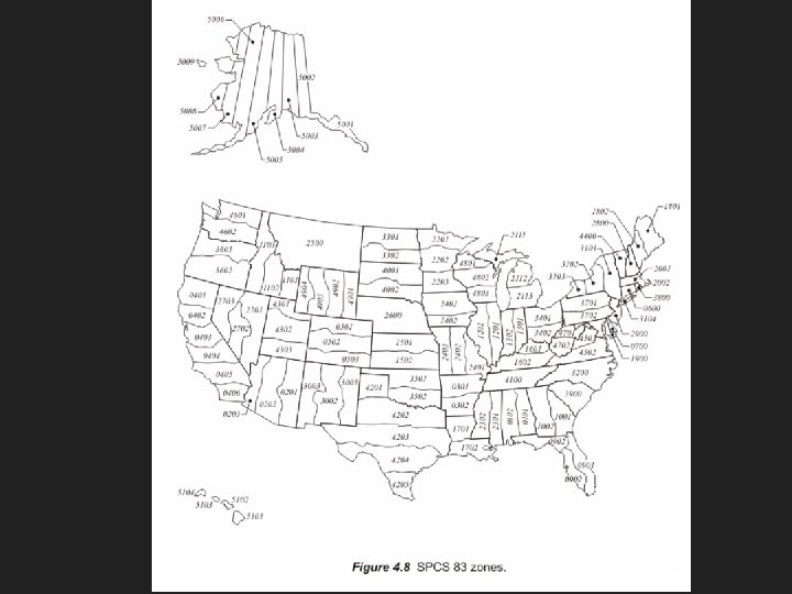 State Plane Coordinate (SPC) Systems Standard set of projections for the United States developed in 1930’s Specifies positions in Cartesian coordinate systems for each state Used for local surveying and engineering applications Points are projected from their geodetic latitudes and longitudes to x and y coordinates in the State Plane systems Conformal mapping system for US with a maximum scale distortion of 1 part in 10, 000