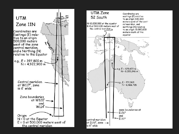 Universal Transverse Mercator Coordinate System At equator a zone is about 40, 000/60 = 667 Km wide Any point can be described by ‘Easting’ and ‘Northing’ values Northing is the distance to the equator, while easting is the distance to the "false easting", which is uniquely defined in each UTM zone The equator is used as the northing origin for all north zones (northing value of zero) South zones have a false northing value added to ensure all coordinates within a zone are positive For UTM south zones, the northing values at the equator are set to equal 10, 000 meters