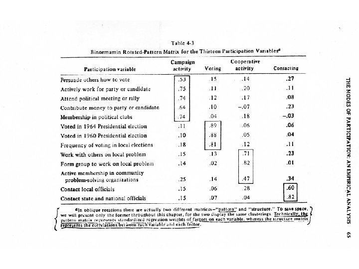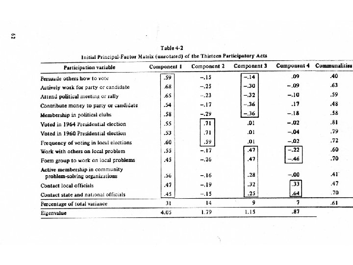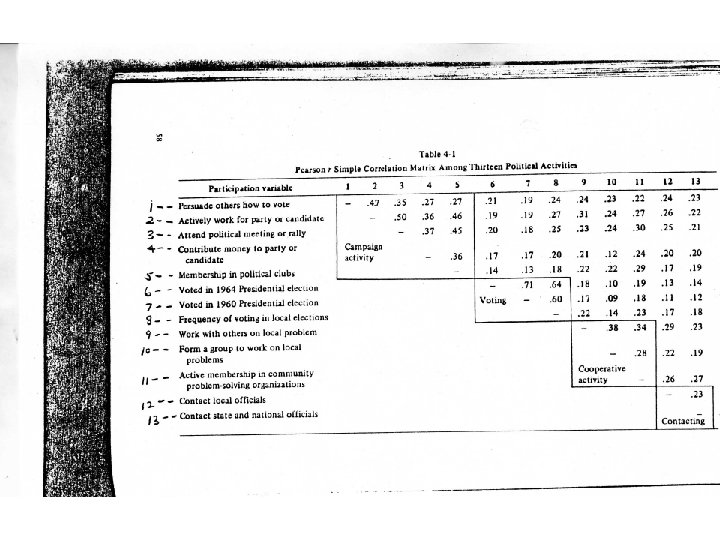 Factor Analysis and Scale Construction • Example from Verba and Nie, Participation in America (1972) • Stata example from U. S. survey data.