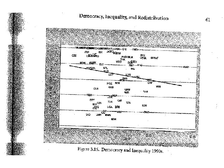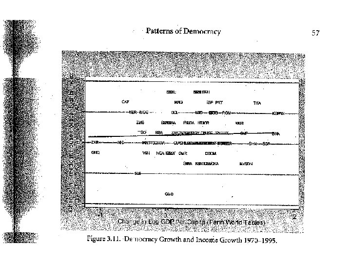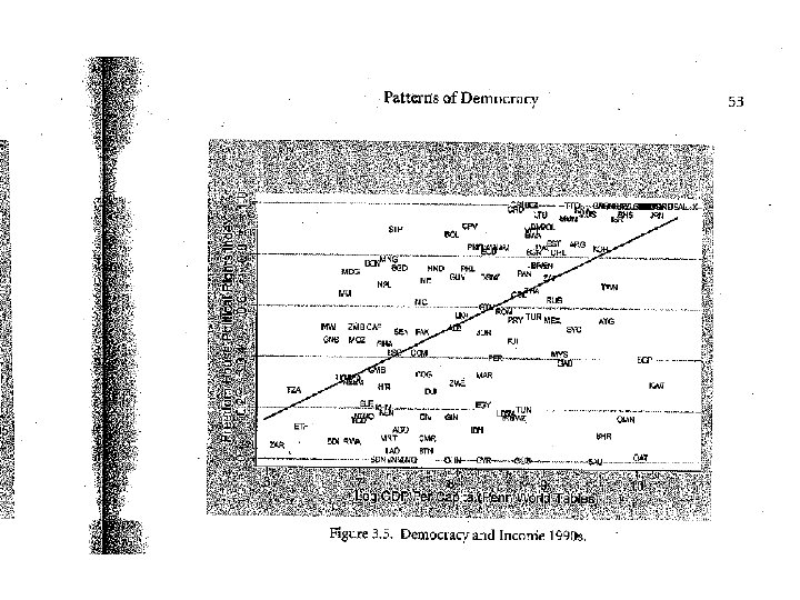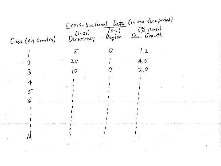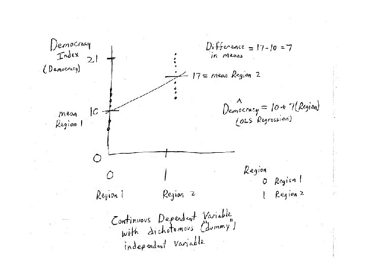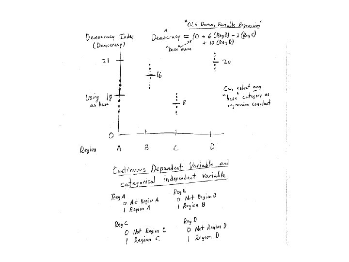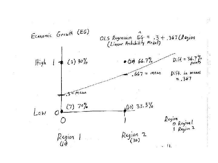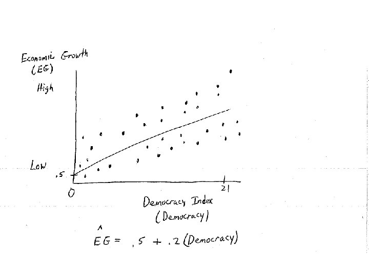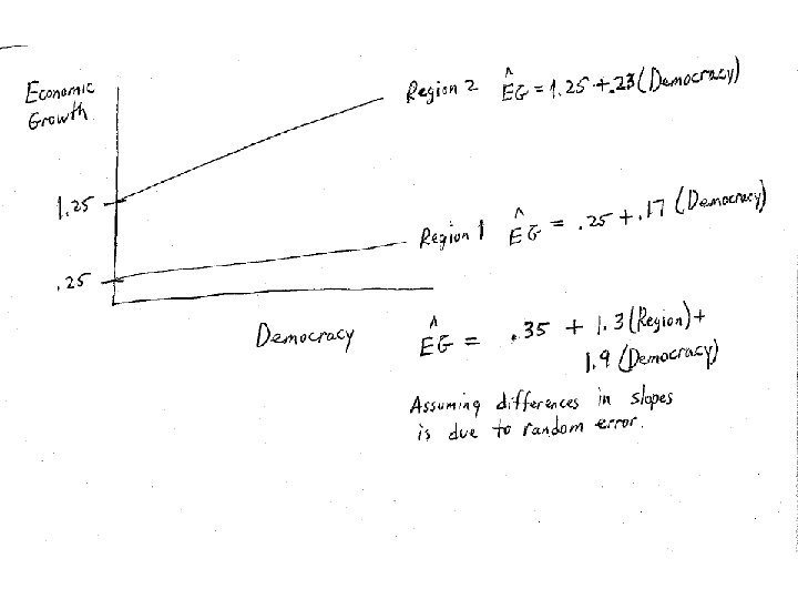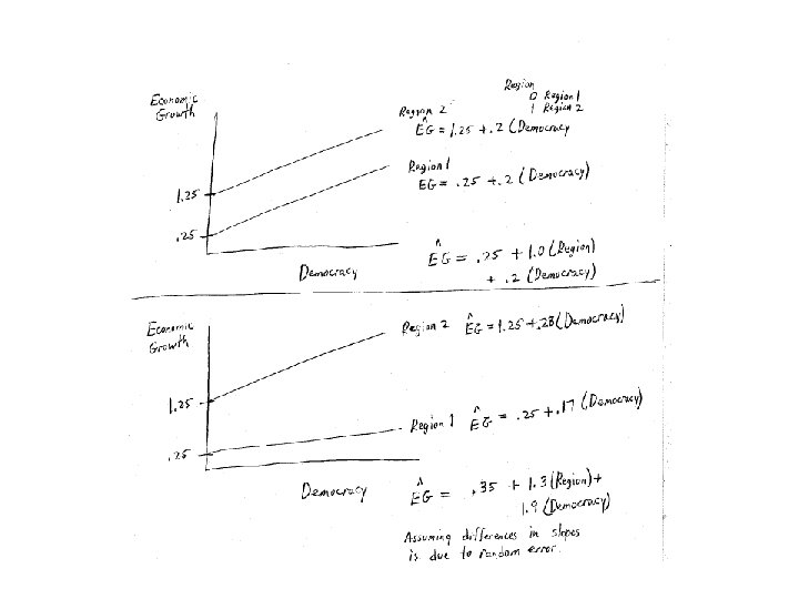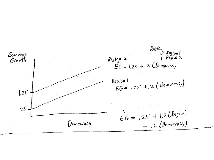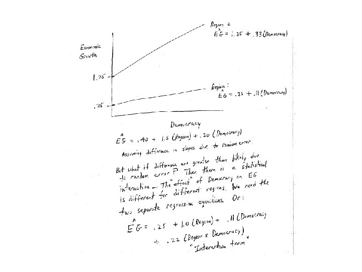 “Effect” of Region and Democracy on Economic Growth (made up data) • Predicted EG = a + b 1(Democracy) +b 2(Region), where we think both democracy and region have possible causal effects. • Case of only two regions (1 and 2; Region is coded 0 -1), to illustrate a simple case of Statistical Control/holding one var. constant. • Linear equation assumes no “interaction”; that is, “effect” of Democracy is the same in Region 1 and 2 (and same for Region; but is it? ). There are different possibilities: (and comic relief)