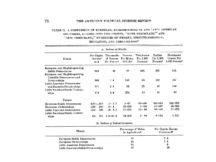 Exploring Theories: Bivariate analysis. “Correlation is not causation!” But you have to start somewhere. . First Steps • Centrality of causal theorizing. Dependent and independent variable(s) unit of analysis? Generalizing to what universe/population? Assumption of unidirectional causation (revisited later)? X ---- > Y e. g. , Democracy ------> Income (of countries) Education ------> Income (of individuals) • Plausibility of theory? Causal mechanism/story?
