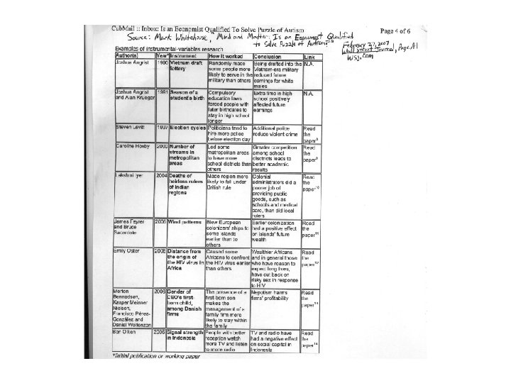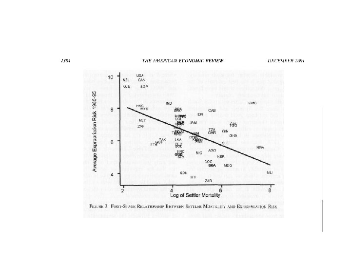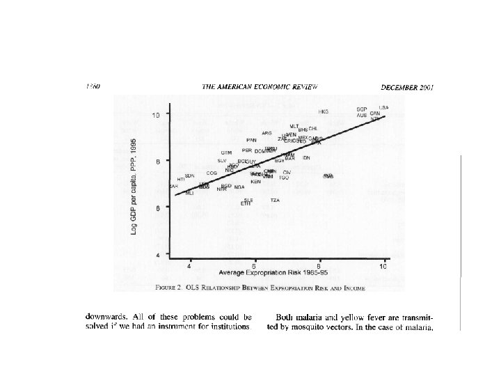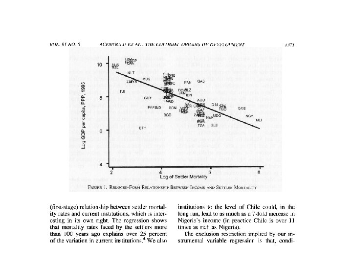 Using “Instruments” to Indentify Causal Effects • Issue of “reciprocal causation”/ ”endogeneity”/”simultaneity bias”. • Need to find an “exogenous” variable as an instrument. • Assumptions about exogeneity and lack of direct causal effect on an endogenous variable. • Example from Acemoglu et al.
