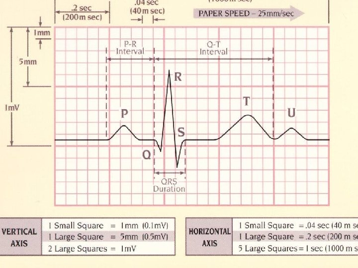 Segments and Intervals n n n n P wave-deflection representing atrial depolarization PR segment-isoelectric line from end of P wave to beginning of QRS-impulse is traveling through the AV node. PR interval -0. 12 -0. 20(time for atrial depolarization-AV node-Purkenje fibers) QRS complex-ventricular depolarization. QRS duration of 0. 04 -. 10 sec from QRS to J-point ST segment-early ventricular repolarization from J-point to beginning of T wave. Elevations not more than 1 mm or deflections o. 5 mm from isoelectric line T wave- ventricular repolarization, usually rounded, positive deflection U wave-smaller polarity as T wave-slow repolarization- not normally seen except in hypokalemia QT interval-total time for ventricular depolarization and repolarization