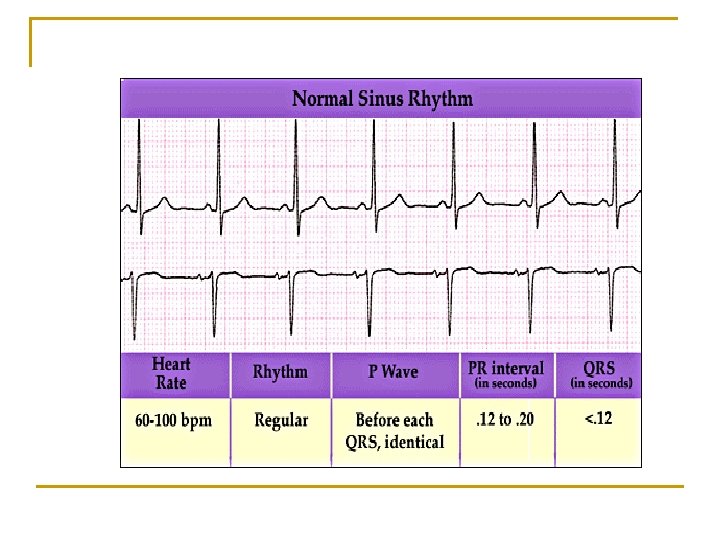 Sinus Bradycardia n Causes: q q n Adverse effects: q n Vagal stimulation, MI, hypoxia Digitalis toxicity Medication side effects Normal to athletes Dizziness, weakness, syncope, diaphoresis, pallor, hypotension Treatment q According to symptoms, atropine to speed up heart rate, pacemaker
