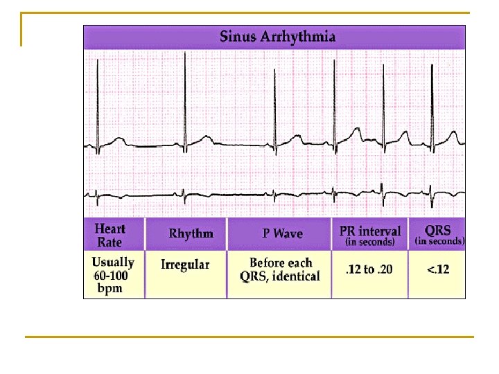 Sinus Arrhythmia n n n n The only irregular rhythm from the sinus node and has a cyclic pattern that usually corresponds with breathing Rate- varies with respiratory pattern Regularity-irregular in a repetitive pattern P waves-Upright in most leads, same shape and one to each QRS P -P interval is irregular QRS-<. 12 sec Cause-usually caused by breathing pattern but can also heart disease Treatment- usually non required