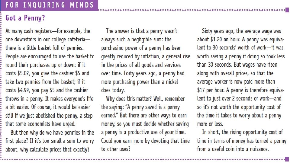 4. People usually exploit opportunities to make themselves better off. • people will exploit opportunities until those opportunities have been fully exploited. • In fact, the principle that people will exploit opportunities to make themselves better off is the basis of all predictions by economists about individual behavior. • When changes in the available opportunities offer rewards to those who change their behavior, we say that people face new incentives. • economists tend to be skeptical of any attempt to change people’s behavior that doesn’t change their incentives. • E. g. voluntary reduction of pollution of manufacturing companies