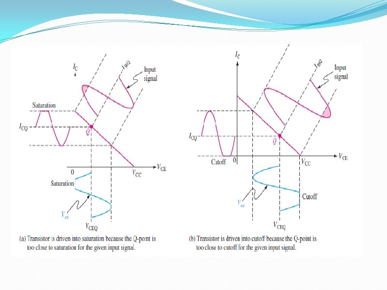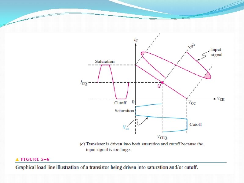 Waveform Distortion under certain input signal conditions the location of the Q-point on the load line can cause one peak of the Vce waveform to be limited or clipped, as shown in parts (a) and (b) of Figure 5– 6. In each case the input signal is too large for the Q-point location and is driving the transistor into cutoff or saturation during a portion of the input cycle. When both peaks are limited as in Figure 5– 6(c), the transistor is being driven into both saturation and cutoff by an excessively large input signal. When only the positive peak is limited, the transistor is being driven into cutoff but not saturation. When only the negative peak is limited, the transistor is being driven into saturation but not cutoff