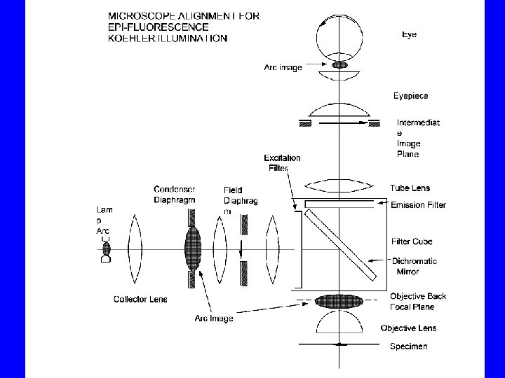 Summary of Koehler Illumination (cont. ) • A telescope is used to view the objective back focal plane (aperture) in order to: a) Adjust the opening of the condenser diaphragm so that the diameter of its image is equal to or slightly less than the diameter of the objective aperture; b) Adjust the focus and x-y position of the lamp image so it is centered and in-focus at the objective back aperture