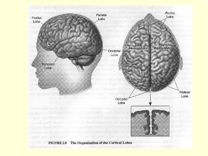 Cortical Structures • Lobes of the brain – occipital lobes – temporal lobes • • • visual processing • Hubel and Wiesel (1965) – parietal lobes • • sensory processing and spatial processing – auditory processing object recognition – parahippocampal region possible storage site for episodic memory and priming frontal lobes: control of action, emotion, and thought • important for working memory