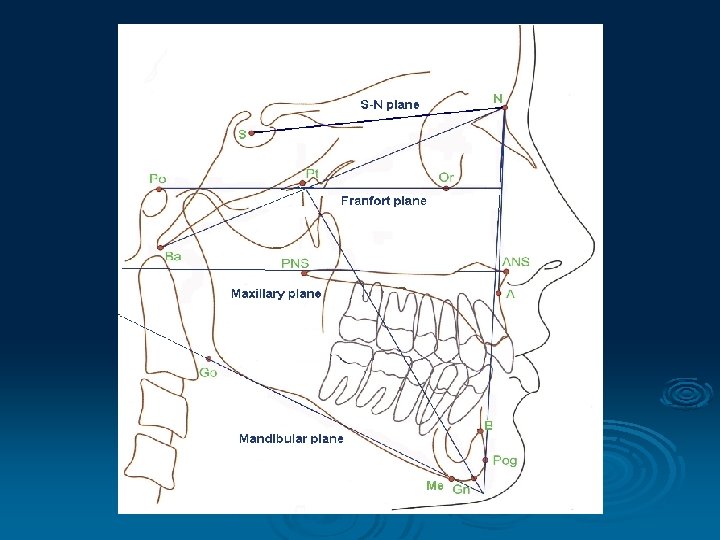 Cephalometric point, plane, line and angles used in dentistry S (Sella) midpoint of sella turcica N (Nasion) most anterior point on fronto-nasal suture Or (Orbitale) most inferior anterior point on margin of orbit Po (Porion) upper most point on bony external auditory meatus ANS (Anterior Nasal Spine) PNS (Posterior Nasal Spine)