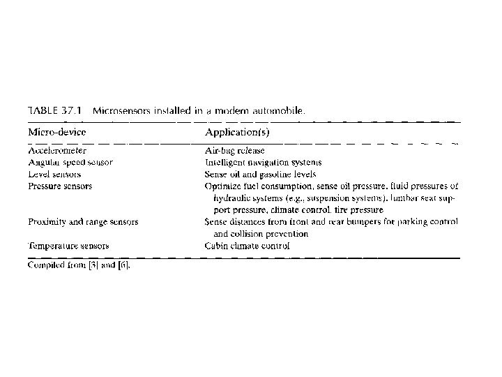 Microsensors and other microdevices • Automotive microsensors and other microdevices are widely used in modern auto- motive products. Use of these microsystems is consistent with the increased application of on-board electronics to accomplish control and safety functions for the vehicle. • The functions include electronic engine control, cruise control, anti-lock braking systems, air-bag deployment, automatic transmission control, power steering, all-wheel drive, automatic stability control, on-board navigation systems, and remote locking and unlocking, not to mention air conditioning and radio. • These control systems and safety features require sensors and actuators, and a growing number of these are microscopic in size. There are currently 20 to 100 sensors installed in a modern automobile, depending on make and model.