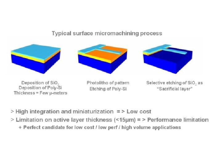 2. Surface micromachining • Unlike Bulk micromachining, where a silicon substrate (wafer) is selectively etched to produce structures, surface micromachining builds microstructures by deposition and etching of different structural layers on top of the substrate • Generally polysilicon is commonly used as one of the layers and silicon dioxide is used as a sacrificial layer which is removed or etched out to create the necessary void in the thickness direction • The main advantage of this machining process is the possibility of realizing monolithic microsystems in which the electronic and the mechanical components(functions) are built in on the same substrate.