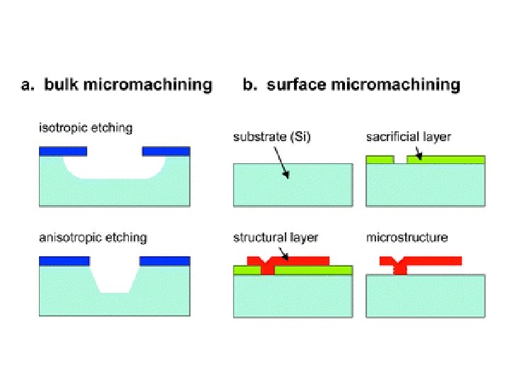 Micromachining techniques 1. Bulk Micro-machining 2. Surface Micro-machining 3. LIGA (Lithographic, electrodeposition, molding) process 4. Silicon layer processes