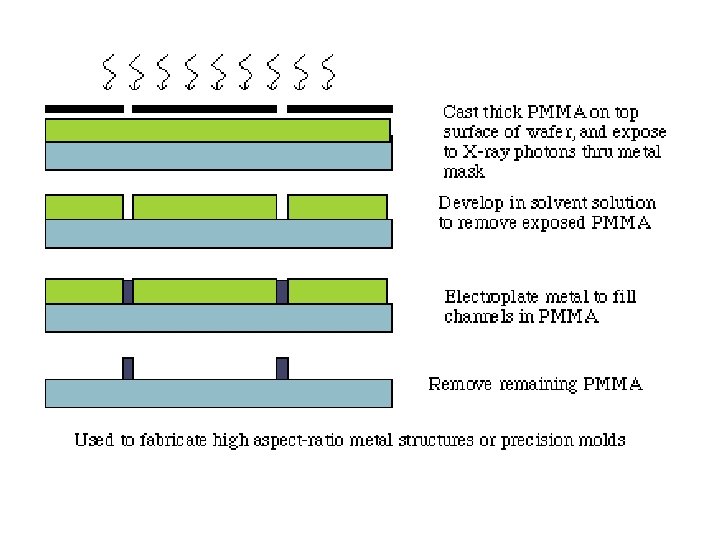 LIGA process 1. 2. 3. 4. Apply resist, X-ray exposure through mask, Remove exposed portions of resist, Electrode position to fill openings in resist, Strip resist for (a) mold or (b) metal part