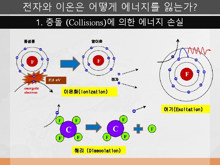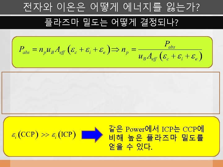 Electron Heating 전자가 플라즈마 챔버에서 에너지를 얻는 과 정 1. Collisional Heating (Ohmic heating) 전기장 + 중성종과의 충돌 2. Collisionless Heating (Stochastic heating) 전자가 진동하는 쉬스(sheath)에 충돌 낮은 압력 (수 m. Torr) : Collisionless heating > Collisional heating 높은압력 (> 수십 m. Torr) : Collisional heating > Collisionless heating