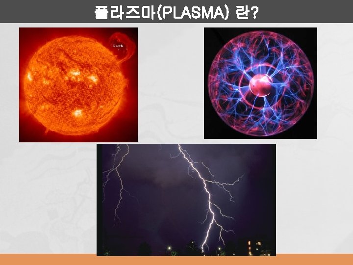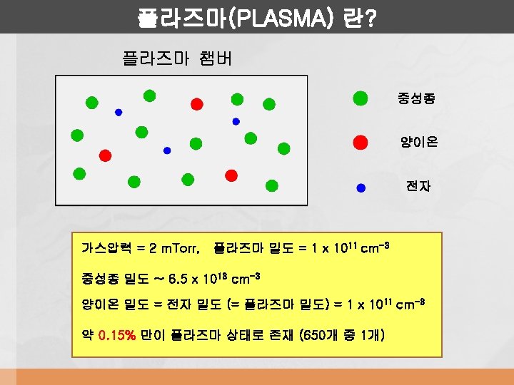 플라즈마(PLASMA) 란? 중성종 (neutral species) 양이온 (positive ion) 전자 (electron ) 플라즈마 (PLASMA)
