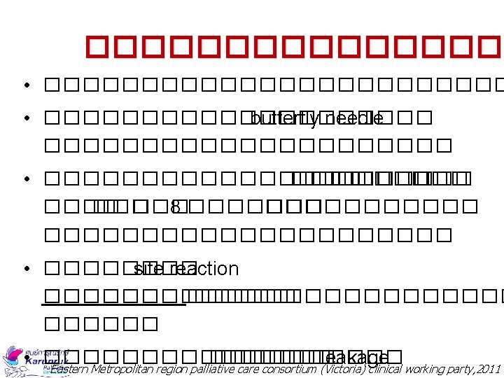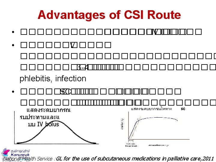 Disadvantages of Bolus Subcut Route • ����������� IV ������ • ������ inflammation ���� irritation ��� • ������ allergic reaction ������ • ������ leakage ������������ • ������������ shock, circulatory failure, severe dehydration) hypercalcaemia (��� coagulopathy ������������ National Health Service : GL for the use of subcutaneous medications in palliative care, 2011