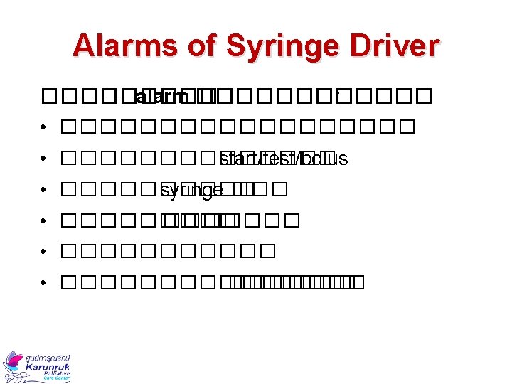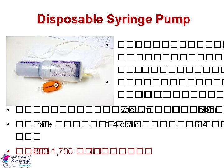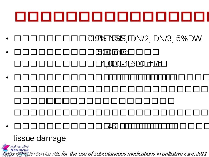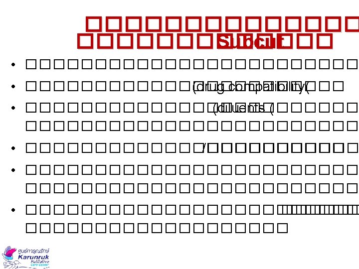 Preferred Diluent ? • ����� Syringe driver drug compatibilities practice guidelines 2013 • NSS ��� SWI ������������������ (stability) �� site reaction • �������� 2 -3 ������ syringe �������������� NSS ��� SWI- NSS ������������ Eastern Metropolitan region palliative care consortium (Victoria) clinical working party. Syringe driver drug compatibilities-practice guideline 2013