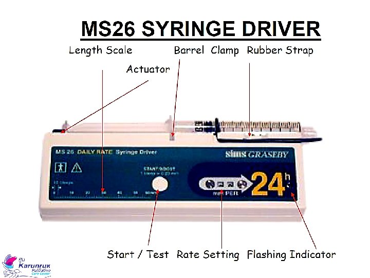 Reference • Dickman A, Littlewood C, & Varga J. The syringe driver: continuous subcutaneous infusion in palliative care. New York: Oxford University Press. • The Palliative Care Formulary • Eastern Metropolitan region palliative care consortium (Victoria) clinical working party. Syringe driver drug compatibilities-practice guideline 2013, Australia. • Greater Glasgow and Clyde. Guidelines for the use of subcutaneous medications in palliative care for adultsprimary care and hospices. NHS Greater Glasgow primary care palliative care team.