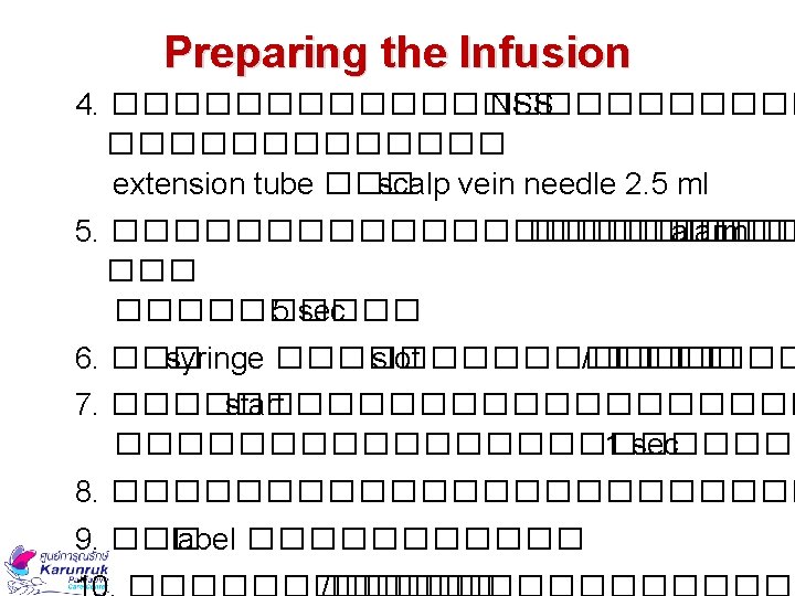 Preparing the Infusion 3. ��� syringe 20 ml �������� NSS ���� 11 ml ����������� (��� 4 ml (�������� 15 ml ����� scale ����������� 5 ���������� 48 mm Rate mm/hour Fluid length mm Infusion time 48 mm 24 hours = 2 mm/hour