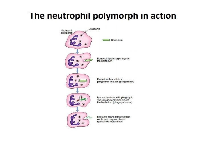 What are the key cells involved in acute inflammation? • Neutrophil polymorphs = hallmark of inflammation – Phagocytose pathogens • Phagocytosis: pathogens ingested to form phagosome, lysosomes released from neutrophils to kill pathogens, and then expelled from phagolysosome • Macrophages – secrete chemical mediators essential for chemotaxis