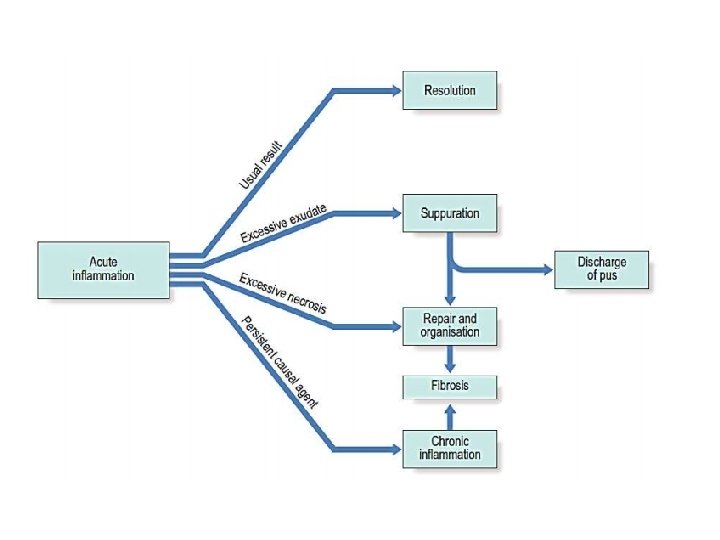 Outcomes of Acute inflammation • Resolution – complete restoration of the tissues to normal • Suppuration – formation of pus • Organisation – When tissue is replaced with granulation tissue as part of the healing process • Progression to chronic inflammation