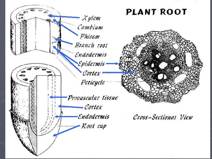 Parts of Roots ► Root hairs - site of absorption, one-celled, white, fuzzy hair-like growths that develop near the end of the root branches ► Root tip - where the root grows in length (4 to 6 cm of the “free end”) ► Root cap - provides protection for the root tip ► Epidermis - the outermost layer of cells ► Cortex: - undifferentiated plant tissue from which new cells arise at the tips of roots (under root cap)