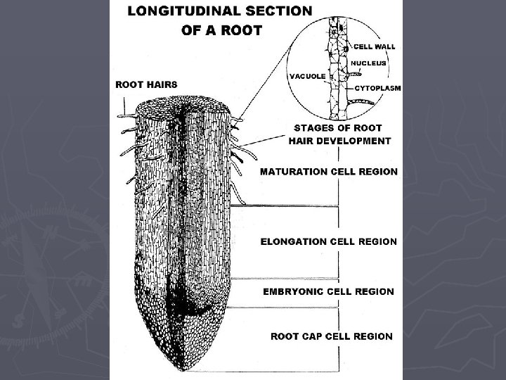 Parts of Roots ► Growing point - just back of the root cap where active cell division ► Vascular tissue - is within the cortex, contains cells which transport water, nutrients, and minerals to all parts of the plant. ► Elongation region - where rapid growth in the length of the root takes place. ► Region of maturation - lies behind the growing point and is where secondary roots emerge.