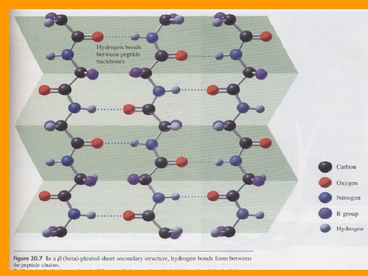 Secondary Structure – Beta Pleated Sheet • Polypeptide chains are arranged side by side • Hydrogen bonds form between chains • R groups of extend above and below the sheet • Typical of fibrous proteins such as silk