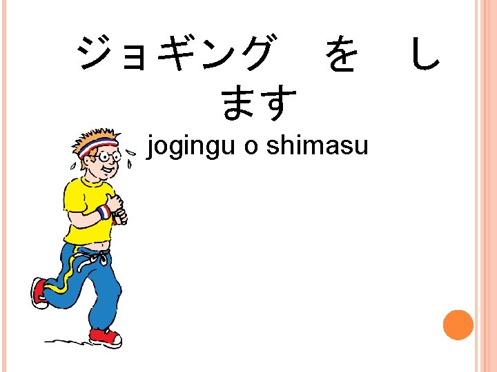 RELATIVE TIME THING を/に VERB まいしゅう ジョギング を I go jogging every week. します。