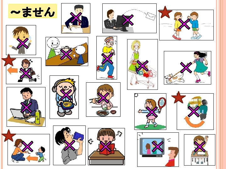 NEGATIVES Negatives are formed by changing the Masu ます to masen ません. OBJECT + particle を + バナナ を たべません。 Banana o tabemasen. I don’t eat (won’t eat) banana. VERBません