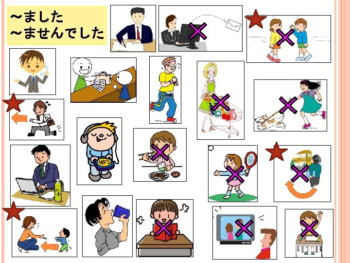 PAST TENSE Past tense (I did something) ます changes to ました OBJECT + particle を + バナナ を たべました。 Banana o tabemashita. I ate a banana. VERBました