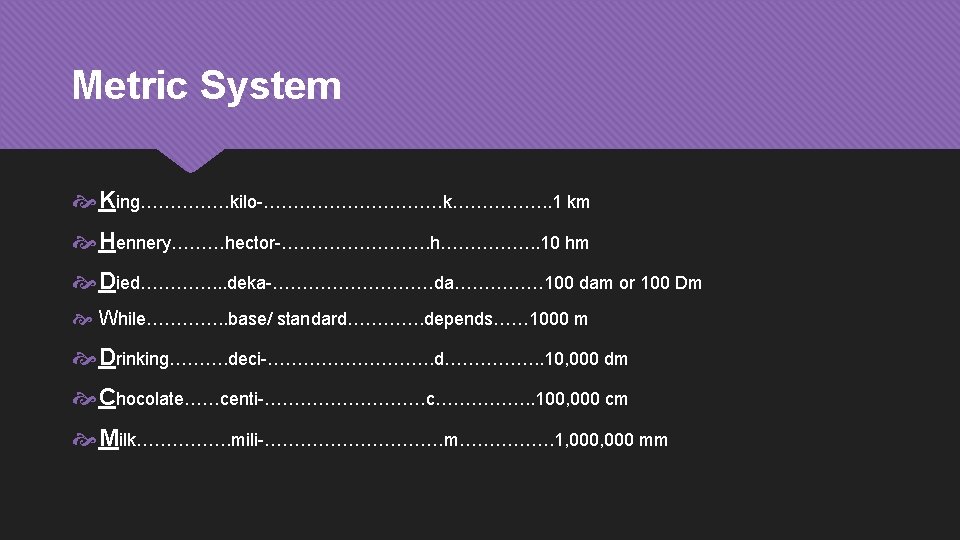 Metric System Scientists use the metric system when collecting data and performing experiments Based on a decimal system You can change between prefixes simply by moving the decimal place in most situations Common types of measurements: Length, volume, mass Each type of measurement uses the same prefixes
