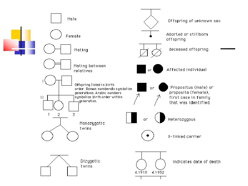 Pedigree analysis for single gene disorders permits To define a pattern of inheritance dominant or recessive, autosomal or X-linked) ( To define genotype of family members To calculate the risk of affected child in the family To study factors affecting the expression of a gene