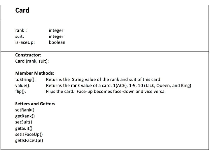 Setters and Getters • Setters and Getters and mutator and accessor methods. • Mutator methods are used to change or set the data of an object: card 1. set. Rank(2); • Accessor methods do not change the data, but rather access (get) the data of an object: card 1. get. Rand ();