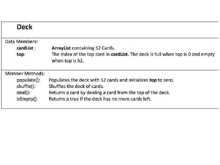 Practice • Create the Deck and Card class. • Create a test class that performs the following: a. Create a deck of cards. b. Deal cards until there are no more cards left in the deck. c. Repopulate and shuffle the deck. d. Deal until there are no more cards left in the deck.