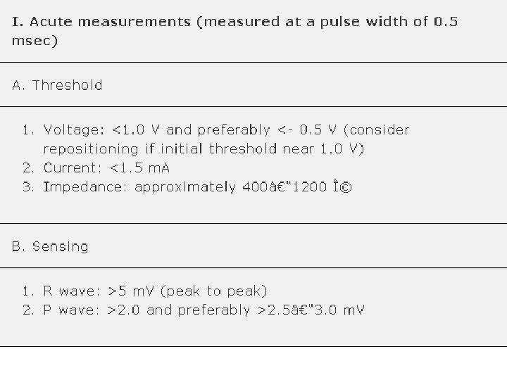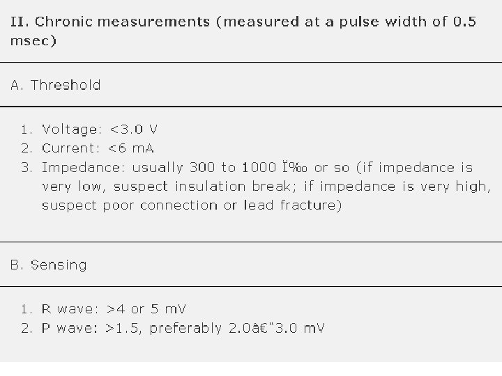-Safety margins -When a threshold is determined by decrementing the pulse width at a fixed voltage • At a given voltage where the pulse width value is <. 30 ms: Tripling the pulse width will provide a two-time voltage safety margin. – Daily fluctuations in threshold that can occur due to eating, sleeping, exercise, or other factors - a/c pacing system - higher safety margin, due to the lead maturation process- occur within the first 6 -8 weeks following implant.